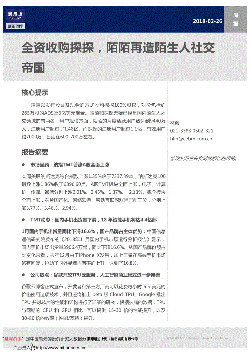 2018-02-26 周报莫尼塔(上海)信息咨询有限公司财新智库旗下公司Members of Caixin Insight Group 全资收购探探,陌陌再造陌生人社交帝国核心提示陌陌以发行股票及现金的方式收购探探100%股权,对价包括约265万股的ADS及6亿美元现金。